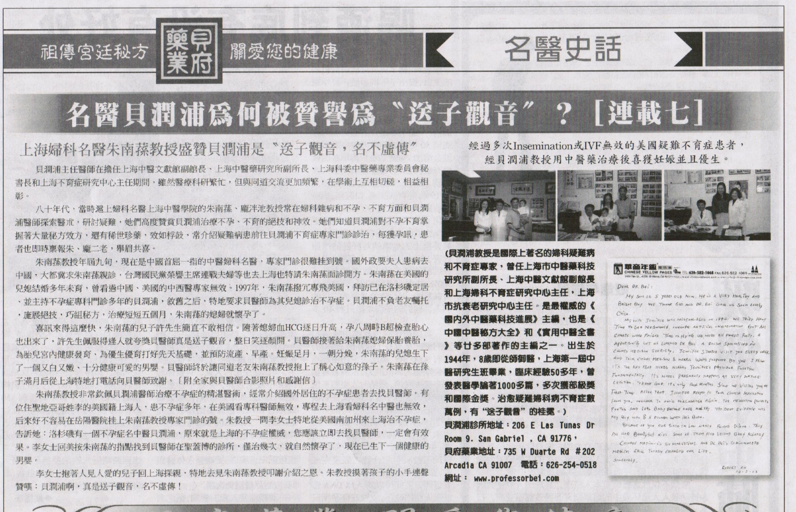 朱南荪教授非常钦佩贝润浦医师治疗不孕症的精湛医术,经常介绍国外居住的不孕症患者去找贝医师。有位住圣地亚哥姓李的美国籍上海人,患不孕症多年,在美国看专科医师无效,专程去上海看妇科名中医也无效,后来好不容易在岳阳医院挂上朱南荪教授专家门诊的号。朱教授一问李女士特地从美国南加州来上海治不孕症,告诉她:洛杉矶有一个不孕症名中医贝润浦,原来就是上海的不孕症权威,您应该立即去找贝医师,一定会有效果。李女士回美按朱南荪的指点找到贝医师在圣盖博的诊所,仅治几次,就自然怀孕了,现在已生下一个健康的男婴。